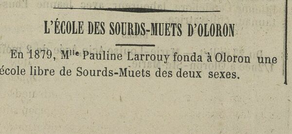 A la fin du XIXe siècle, c’est à Oloron que Marie-Pauline Larrouy (1834-1919) crée une école des sourds-muets en 1879 dont elle sera directrice jusqu’en 1901.